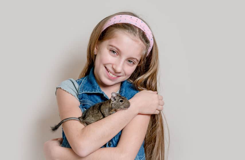 Like most rodents, degus must be kept in pairs so they don’t get bored. They are a lot easier to tame and can become friendlier than chinchillas. Your child will enjoy having degus since they are playful and curious rodents.
