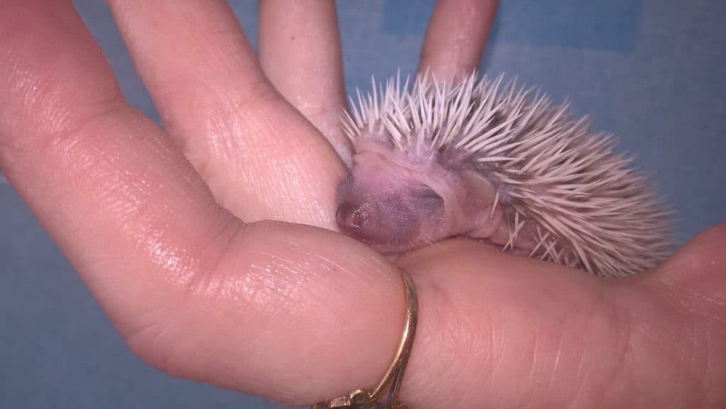 Baby hedgehogs can be held as early as 15 days after they are born. This is what breeders are doing after a female hedgie gives birth. It helps that little baby hedgehogs are held so they get used to being handled more often. You can hold them in your palm with slightly cupped fingers. As they grow they will be more relaxed with standing in your palm.