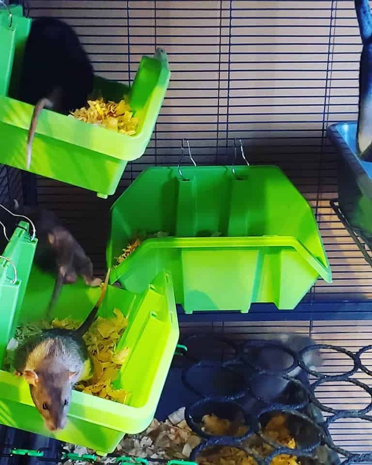 You may notice that some of ours are not the standard charcoal grey; spray painting with Rustoleum to give your cage a splash of ‘you’ is great – but make sure to leave it in a pet-free space for a minimum of 3-5 weeks after painting to air out, before putting your rats in there.