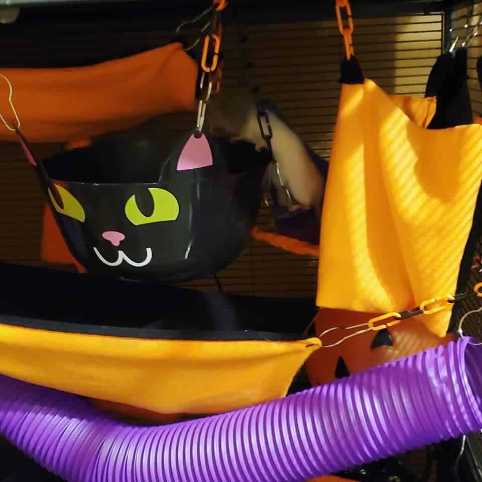Here is the girls’ setup. Same idea: lots of hiding places and plenty of entertainment. We love Halloween so that is our year-long theme. They enjoy being bundled up together in their hides. We personally like to make our own hammocks.