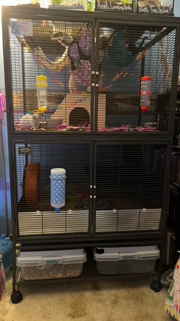 Rats are fossorial by nature, so having a cage that is wide enough to provide ground space is just as important as a cage that includes height. Many new adopters come to me with links to cages that are tall rather than wide. Having a healthy mix of both provides the proper enrichment needs for rats.