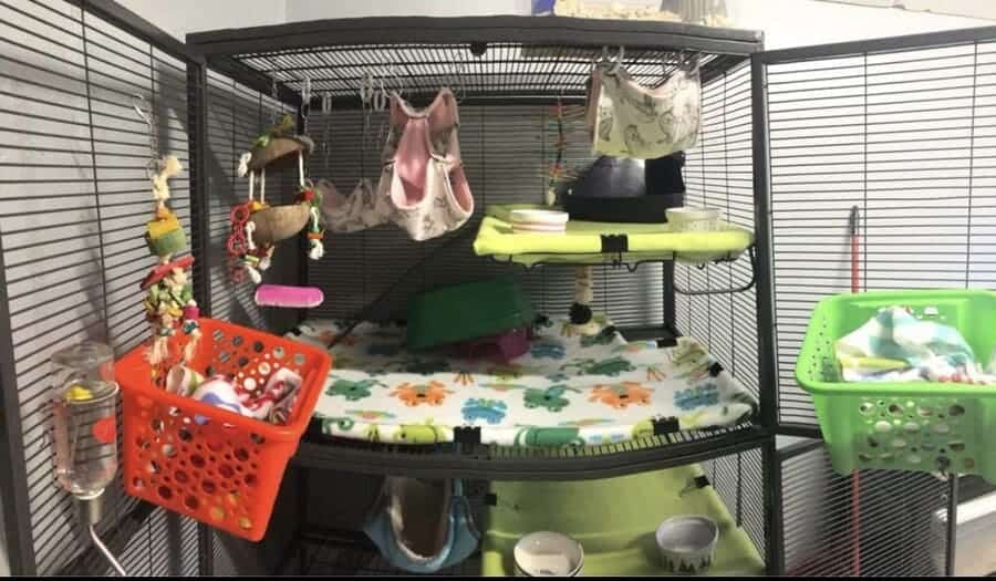 I like to have their living space on top. This means food, water, houses, hammocks, and blankets for them to cuddle in. I use 3-6 water bottles depending on how many I have in there at the time. Currently, I have 15 adults and juveniles. They have plenty of room to run, play, cuddle and wrestle around.