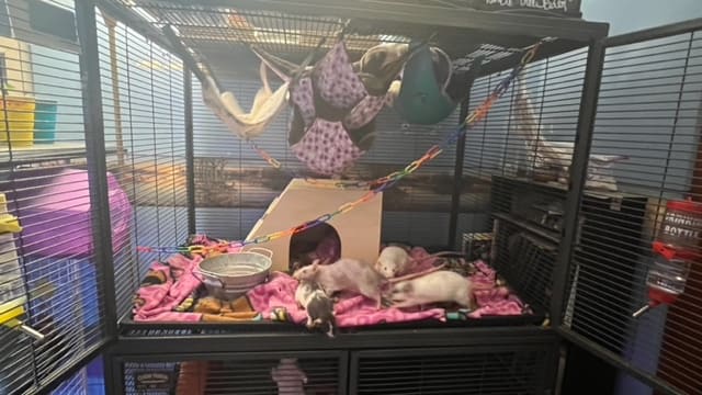 Most of our cages have made hammocks, DT plastic shower rings, DT rope, and metal baskets. My rats explore and get both levels, males and females are always separated of course!